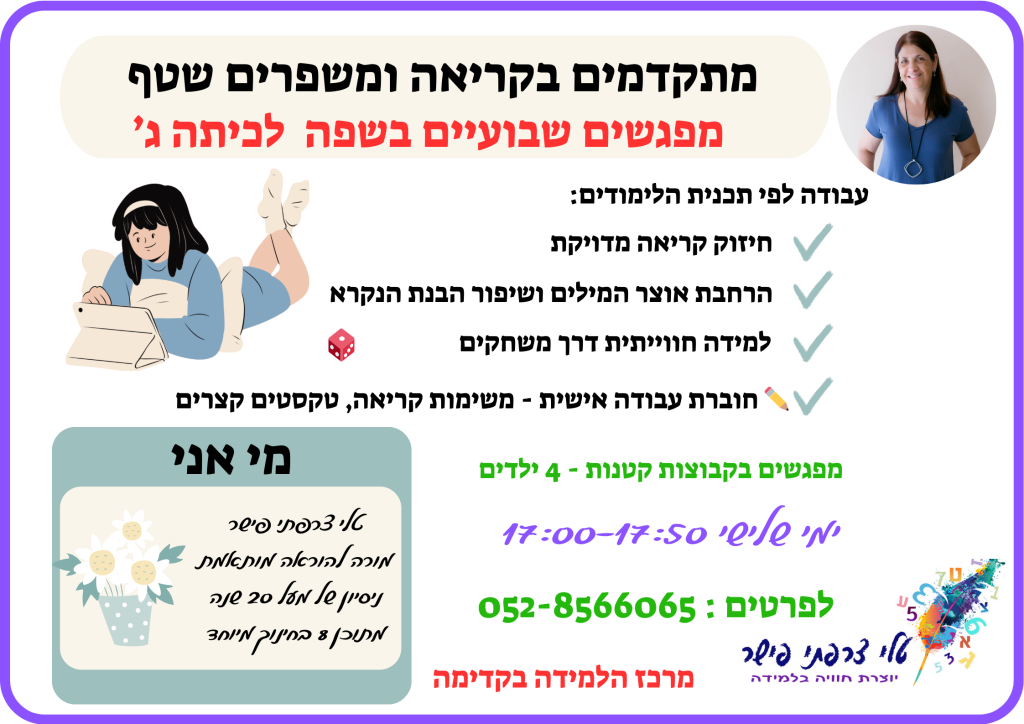 📖 עבודה לפי תכנית הלימודים – חיזוק קריאה מדויקת, הרחבת אוצר מילים ושיפור הבנת הנקרא.