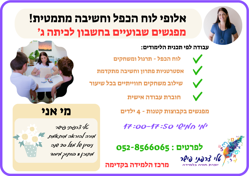 • 📘 לומדים לפי תכנית הלימודים – לוח הכפל, אסטרטגיות פתרון וחשיבה מתמטית מתקדמת.
