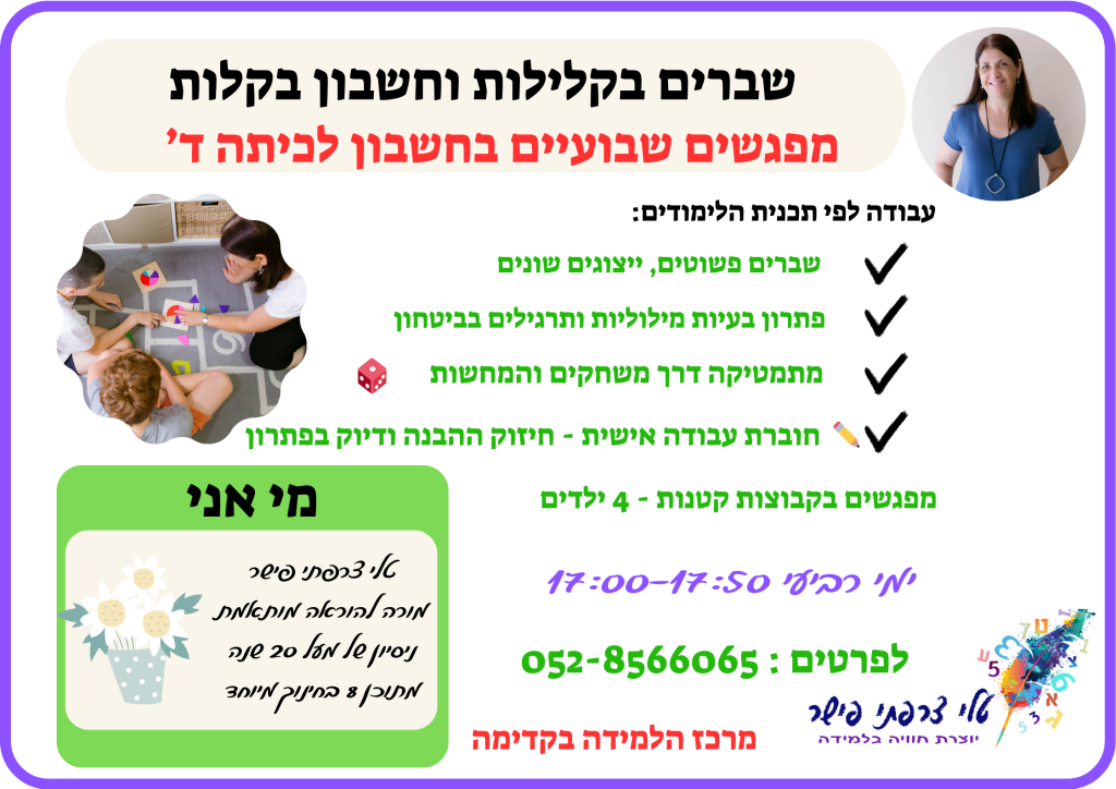 • 🎲 חווים מתמטיקה דרך משחקים והמחשות – קוביות, כרטיסיות, דגמים ושפע פעילויות שמקלות על ההבנה.